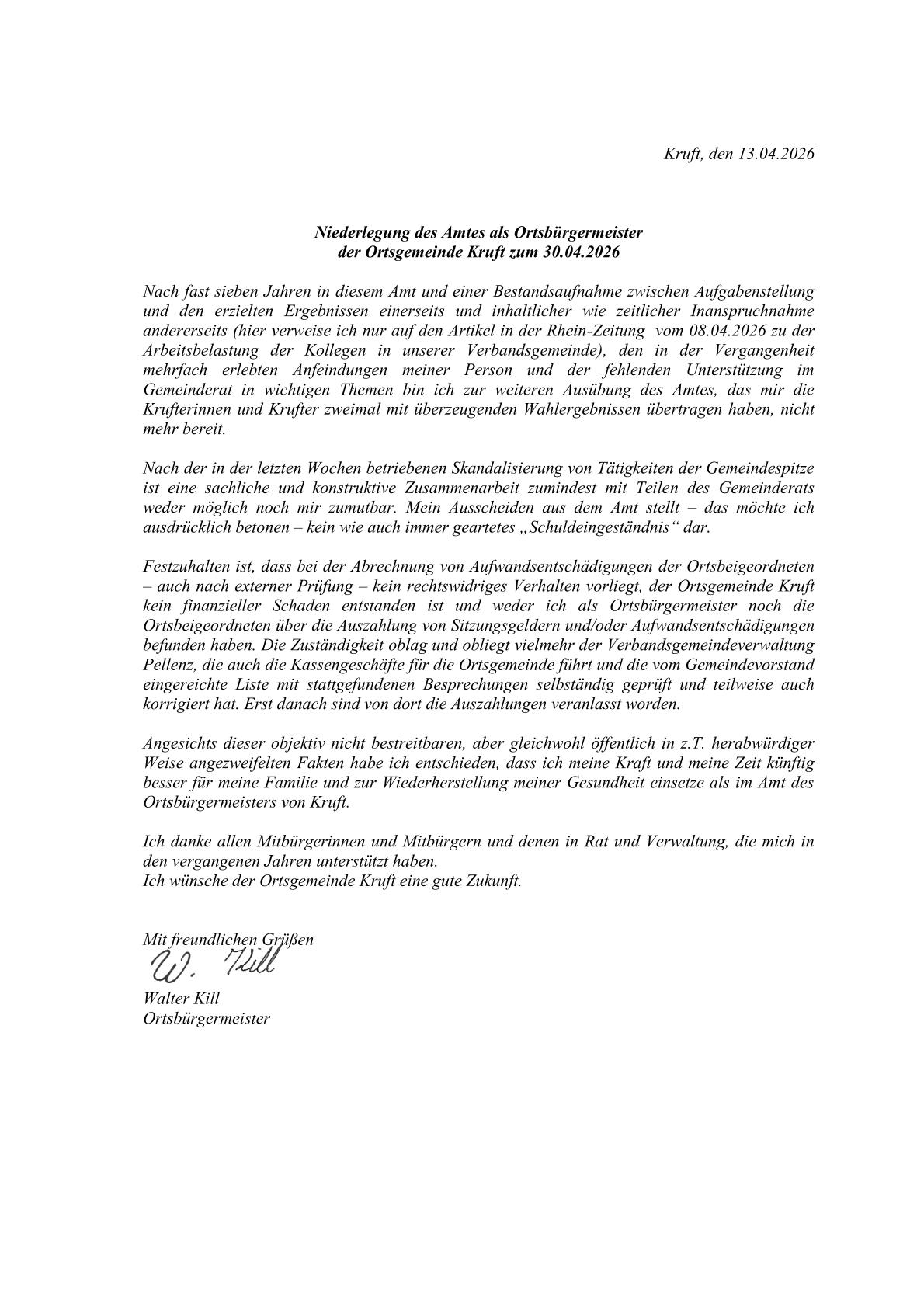 14 Apr., 2026 Niederlegung des Amtes als Ortsbürgermeister Niederlegung des Amtes als Ortsbürgermeister